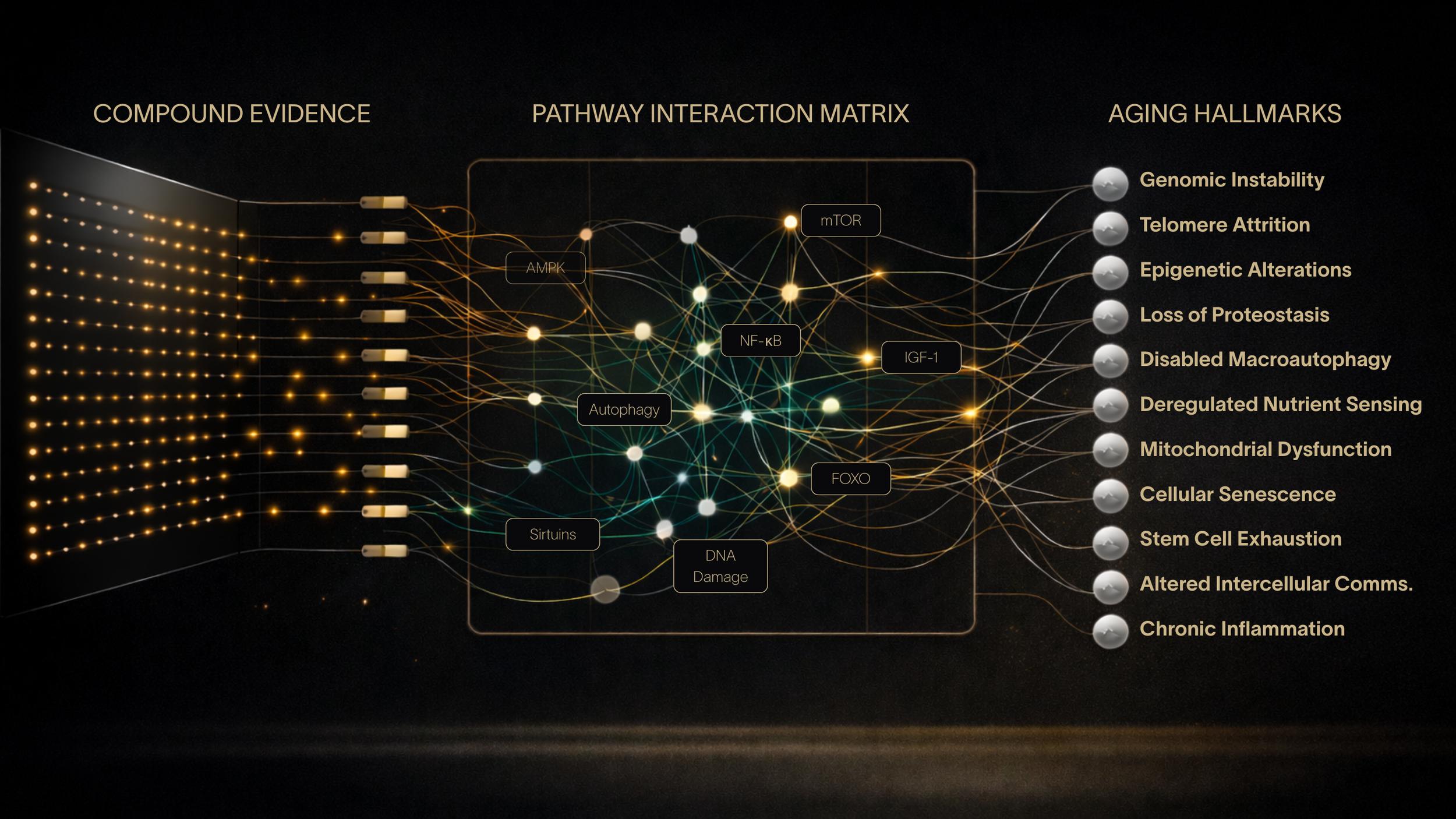Our research team built a multi-layer optimization engine that maps how molecular interventions influence the core mechanisms of aging.