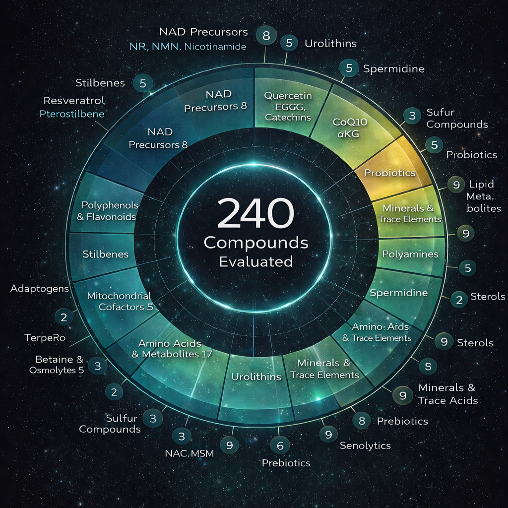 We evaluated each compound using a structured evidence framework that connects mechanisms, pathways, and aging outcomes.