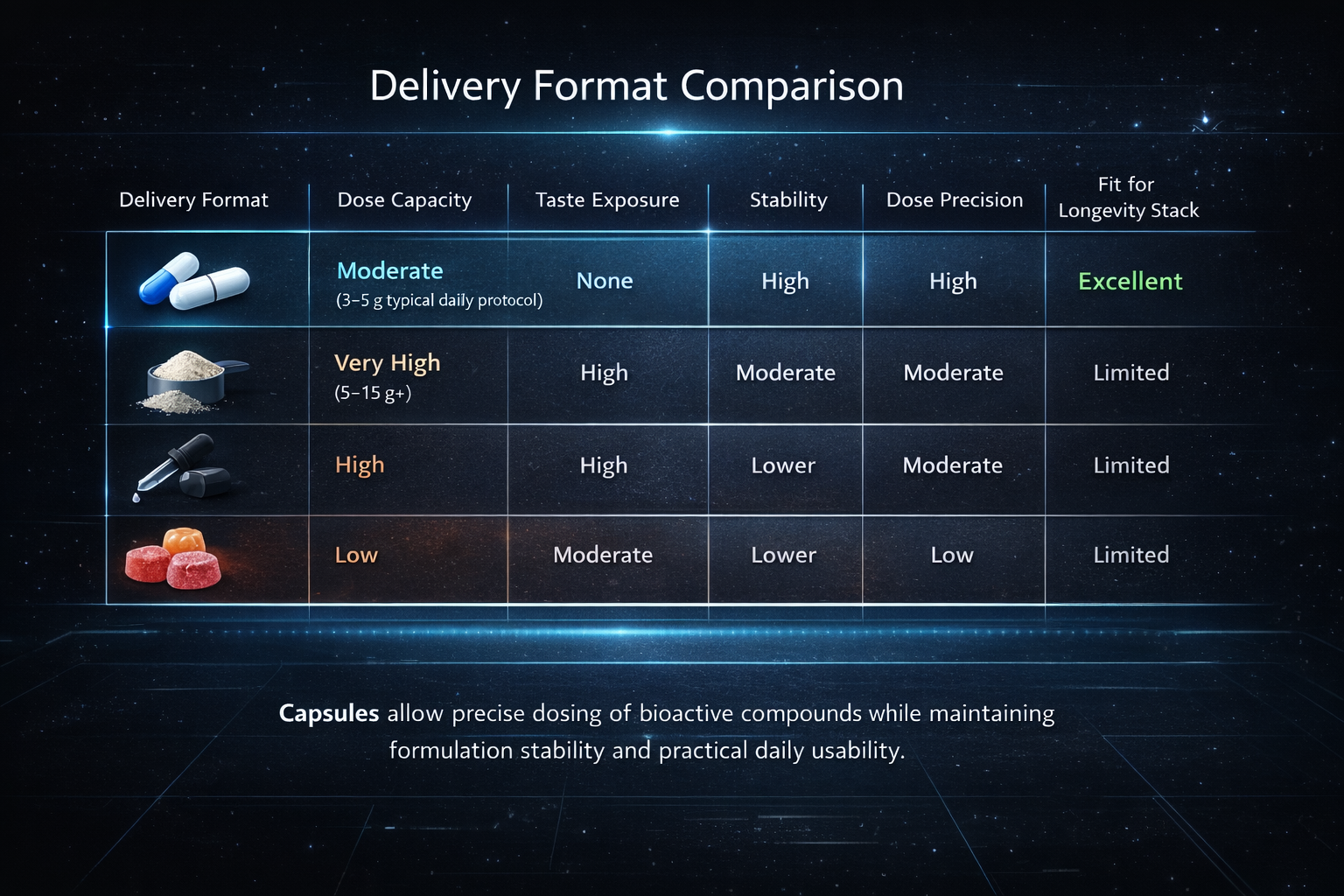 Capsules provide a neutral delivery format that allows precise dosing while avoiding taste masking challenges and excessive sugar or flavoring systems.