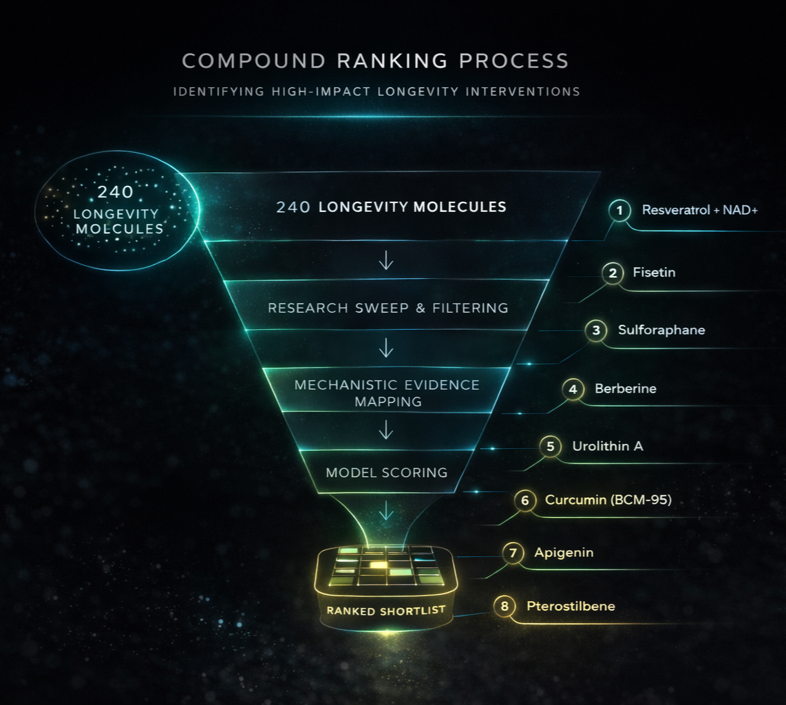 The result is a ranked shortlist of longevity interventions with the strongest mechanistic influence on the drivers of aging.